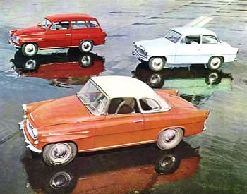 Warszawa: Esta marca polaca, producida por la F.S.O de Varsovia, fabricaba estos autos basada en los modelos Pobieda producidos por la GAZ soviética, con un face lift en la parte trasera por parte de la casa italiana Ghia. Usaba un motor de cuatro cilindros, 2.200 c.c y una potencia de 72 HP, una caja de cambios accionada desde la columna de dirección. Era un sedán cómodo para cinco pasajeros. Se vendió en Colombia durante los años 1966 y 1968. El color de estos era gris, con unas figuras ajedrezadas en el techo. Tuvo una efímera vida en nuestro país principalmente por a falta de repuestos y de mano de obra calificada. Desapareció casi por completo. También llegaron algunas Station Wagon y Pickups para servicio diplomático, posteriormente vendidas a particulares.