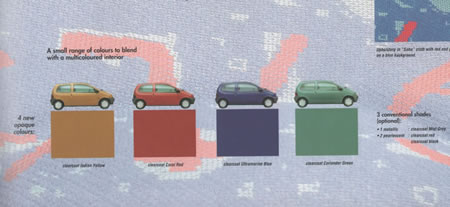 Para la espaciosa carrocería monovolumen, pequeña por fuera y muy grande por dentro, se escogieron colores poco convencionales el azul ossy, el verde gowi, azul violeta y rojo tango e interiores igualmente vanguardistas, coloridos y modernos que reafirmaron su propuesta de diseño.