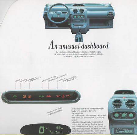 Para el interior se montó el tablero en el centro, con gestión digital y testigos luminosos ubicados frente al conductor, algo poco convencional. Las sillas delanteras se plegaban y desplazaban para permitir el acceso a la silla posterior que como dato curioso se podía desplazar hacia atrás y hacia adelante con lo que aumentaba y disminuía el espacio para carga y pasajeros de acuerdo con las necesidades de cada momento. Además estas sillas con sus múltiples graduaciones permitían convertir el interior en una práctica cama doble.