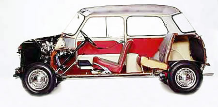 Mini: La creación de Alec Issigonis (1906-1988) fue presentada el 26 de agosto de 1959. Su propuesta totalmente inédita para ese momento se basa en una carrocería muy pequeña por fuera con 3,05m de largo, 1,41 m de ancho y 1,35 m de alto pero con un gran espacio interior, debido al montaje de las ruedas en los cuatro extremos lo que también contribuía a su estupenda estabilidad (suspensión basada en sólidos cauchos de compresión) y a la instalación del motor en la parte delantera de forma transversal y tracción también delantera, conceptos en que se basa el automóvil moderno.