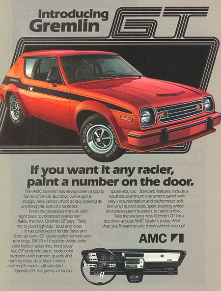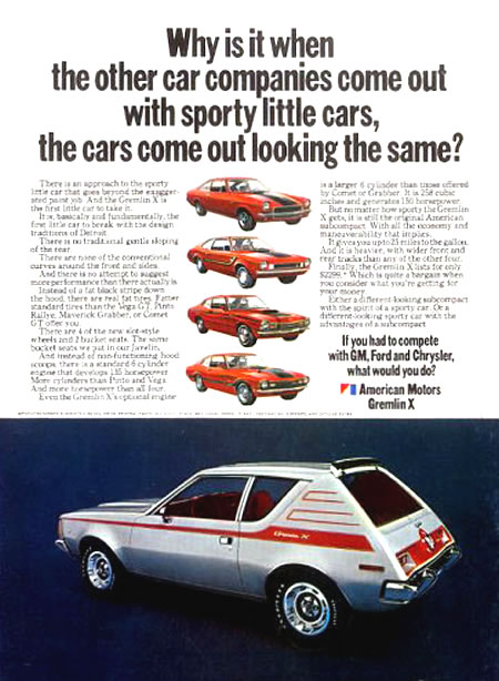 La American Motors Corporation dentro de su filosofía siempre buscó producir modelos innovadores para nichos de mercado específicos descuidados por otros fabricantes con precios atractivos. Bajo estas premisas concibió sus modelos Gremlin y Pacer que dividieron opiniones en cuanto a sus diseños, pero eso si jamás pasaron ni pasarán inadvertidos y si son futuristas o excéntricos lo deberá juzgar cada uno según su gusto. Incluso los dos modelos se llegaron a ofrecer en algún momento en versiones con motor eléctrico salidos directamente de fábrica.