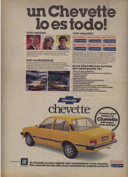 Chevrolet Chevette: Aparecido a finales de 1981 en su versión de tres puertas, tuvo un gran éxito como taxi en su presentación sedán. Utilizó motores de 1.400 y 1.600 c.c montados delante de manera longitudinal. También usó caja de cambios manual de 4 y 5 velocidades. Se dejó de vender en 1996.