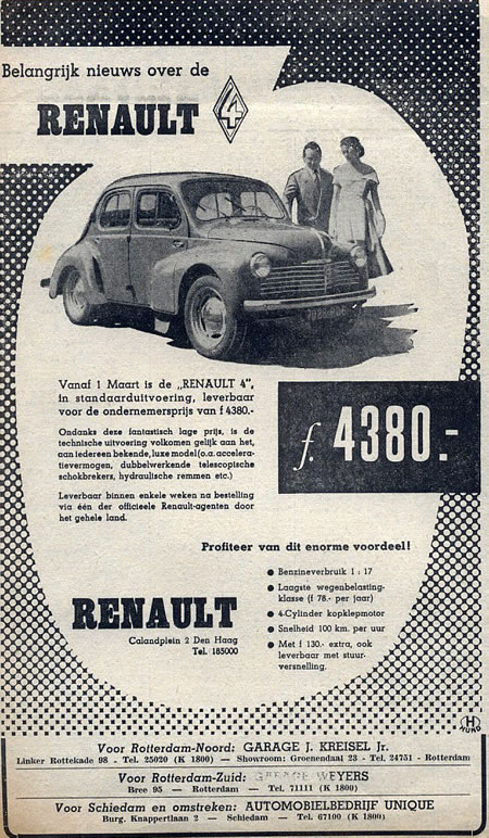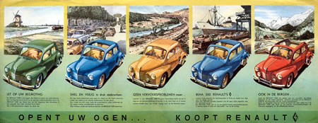 El éxito del 4CV superó todas las predicciones, los pedidos se represaban y el interés por el primer automóvil moderno de Renault crecía como la espuma. Solamente hasta 1949 cuando se terminó de reconstruir y ampliar totalmente la infraestructura física y se montó nueva maquinaria se pudo comenzar a cumplir con las entregas de manera oportuna. El éxito en ventas llegó de la mano del reconocimiento deportivo, con triunfos como el ascenso al Mont Ventoux en 1948, el Rally de Montecarlo en 1949, las “24 Horas de Le Mans en 1951y las “Mil Millas” de 1952. Además de estos logros se convirtió en el vehículo de acompañamiento preferido por la mayoría de equipos de ciclismo que tomaron parte en el célebre “Tour de France” de esta época.