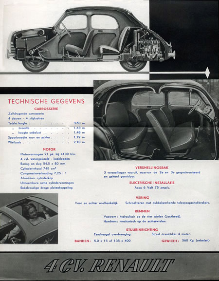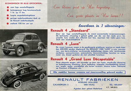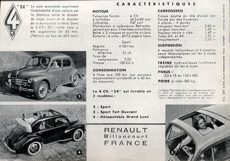 A la par del 4CV se continuó fabricando el veterano automóvil Juvaquatre el primer Renault dotado de carrocería monocasco presentado en 1937, en versiones sedán, y furgoneta que se fabricarían respectivamente hasta 1952 y 1960, además de una carrocería convertible de la que se construyeron muy pocas unidades.