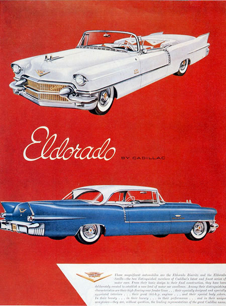 En cuanto al modelo Eldorado, las aletas traseras se vuelven muy estrechas, puntiagudas y protuberantes, anticipando el perfil trasero que tendrán todos los autos de la marca en los años 1957 a 1960.