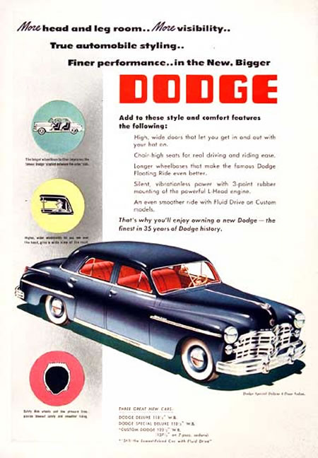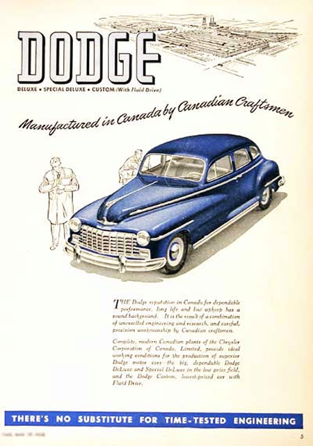 Terminada la Guerra y hasta marzo de 1949 se retomaron los modelos de 1942, y se sometieron a cambios sobre todo estéticos. Se continuó con la producción de las series De Luxe (chasis corto) y Custom (Chasis largo), la producción total fue de 649.999 unidades, además se retomó la producción de las pickups. La propuesta mecánica no fue variada, con la única novedad de la utilización en los Dodge, así como en el resto de productos del grupo de un botón pulsador para encender el motor, montado en el tablero de instrumentos y que sustituyó al tradicional pedal.