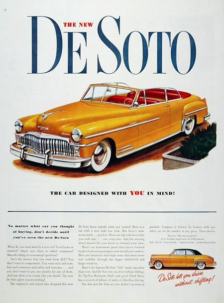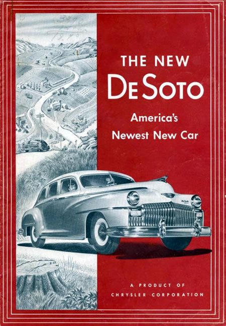 Walter P Chrysler creó esta marca en 1928 para ser el escalón siguiente a la Chrysler y le dio el nombre, en honor del conquistador español de la península de la Florida y descubridor del rio Mississippi Hernando DeSoto (1.500-1542). Por este motivo la silueta detallada de este personaje español es el logotipo de la marca.