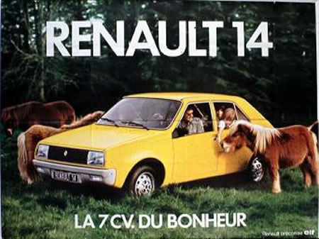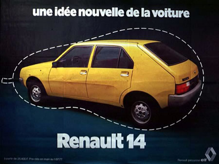 R14: Auto compacto fabricado entre 1976 y 1983 (999,250 ejemplares), presentado con un motor 4 cilindros de 1218 cms cúbicos, el primer Renault en montar un motor delantero de forma transversal. Su propósito era rivalizar con el Volkswagen Golf, pero no tuvo el éxito esperado. La parte de atrás era más ancha que la de adelante, lo que hizo pensar a los publicistas de la agencia Publicis que el auto tenia forma de pera. La campaña de publicidad se baso en esta premisa (un auto en forma de pera) y fue un desastre, pues espanto a los clientes en vez de poner en valor las cualidades de este auto.