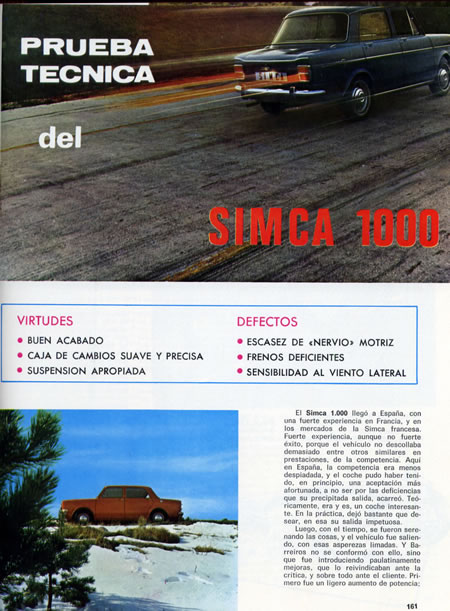 Chrysler-Barreiros: De ahí salió el material para ensamblar nuestros Simcas en Colmotores de Bosa. Se probaron las tres versiones presentes en el momento del reconocidísimo modelo mil: el 1000, propiamente dicho, el 1000 GT que tiene parangón con el 1204 colombiano, y el 900 que es el mismo carro; pero reducido a motor de 844 cc. Para favorabilidad fiscal en España. También allí, el Simca 1000 que llevaba casi un lustro de vida, tenía nuevo aspecto con sus faros grandes y sus pilotos traseros en forma de vaso para Alka-Seltzer y era competencia, tanto del 600 como de otros carros. Fue igualmente el único modelo de esta fábrica producido en Colombia hasta 1977 y segundo carro popular colombiano, pues años antes habían llegado importados para el servicio público los Dodge Dart de línea previa a la conocida en el ensamble nacional correspondientes a la tercera generación del Plymouth Valiant. Estos Dart tenían la particularidad de ser ensamblados, más no fabricados por Barreiros en España con CKD argentino proveniente de Chrysler Fevre-Argentina del allá denominado Valiant IV. Se probaron en la Enciclopedia Volante tres versiones: GT, GL y Dart Diesel. Las dos primeras con la particularidad de contar con faros rectangulares inéditos en la producción americana, y ofrecidos como lujosos y potentes. El segundo, de acabados más espartanos y con motorización diesel original de Barreiros; pero con el hándicap del alto confort, lo mismo que su hermano superior, el Dodge 3700 que también fue probado como el carro más lujoso de España, destinado casi al transporte gubernamental. Precisamente uno de estos carros se haría trágicamente célebre cuando la ETA puso una carga explosiva que lo lanzó de la calle hacia un patio contiguo en Madrid cuando en su interior viajaba el presidente franquista, Luis Carrero Blanco en diciembre de 1973, matándolo en el acto. Otro carro desconocido en Colombia que se probó en Volante fue otro modelo Simca: El 1200. Esta respuesta a la creciente tendencia a la tracción delantera, contaba con quinta puerta en una carrocería de sedán tricuerpo, muy al estilo de los más recientes Citroën Xantia o Xsara, y Hyundai Accent Web. Se le calificaba objetivamente de funcional aunque de acabados austeros y se le alabaron consumos, motor, estabilidad y suspensiones. Salvo uno o dos ejemplares que rodaron por Bogotá hace años, Colmotores nunca consideró su ensamble para Colombia a pesar de ser viable al lado del R6 o del Zastava que competían más contra el superior Dart de Dodge.