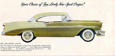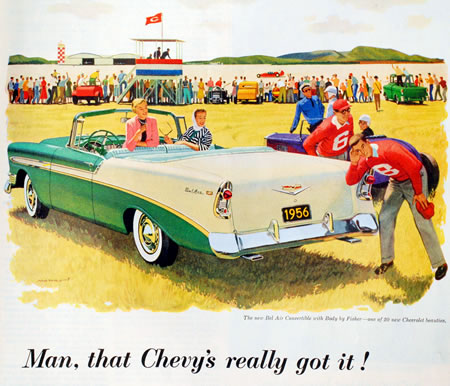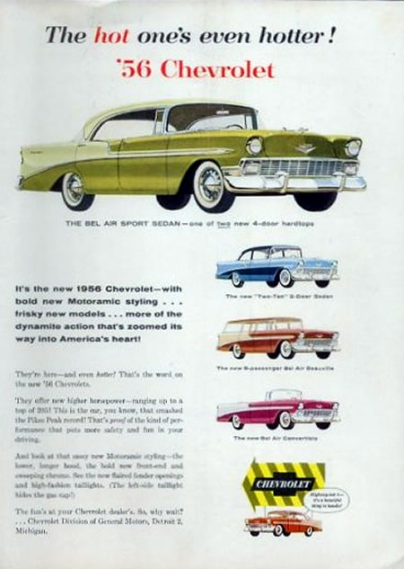 El Chevrolet 1955 fue conocido como “The Hot One” (el auto de moda). Para 1956 el slogan fue "The Hot One ‘s even hotter” (el auto de moda, ahora aun mejor), que muestra bien que la empresa quiso aprovechar la buena reputación del Chevrolet 1955 para promocionar el modelo 1956. Las imágenes son en general dibujos de artistas en escenas familiares y campestres.