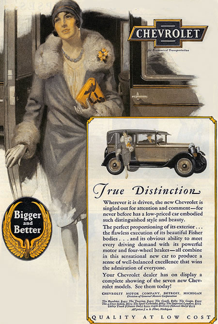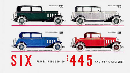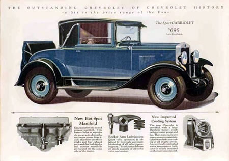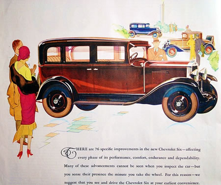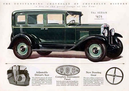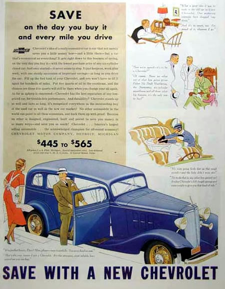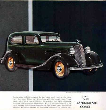 Precisamente el eslogan publicitario del nuevo Chevrolet fue “un motor de 6 cilindros por el precio de uno de cuatro”. Un sedan dos puertas (coach) costaba 595 dólares, 100 dólares menos que los otros automóviles de 6 cilindros de la competencia.