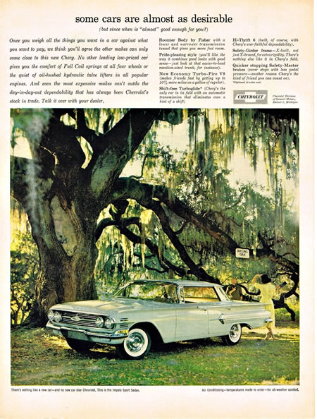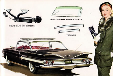 El Impala ofrecía elementos tales como bocelería en aluminio adonizado, reloj eléctrico, filtro de aceite para el motor V8 y copas grandes). Un cupé hardtop Impala con motor V8 de 348 pulgadas cubicas era prácticamente igual de grande y potente que un Buick o un Cadillac de la época.