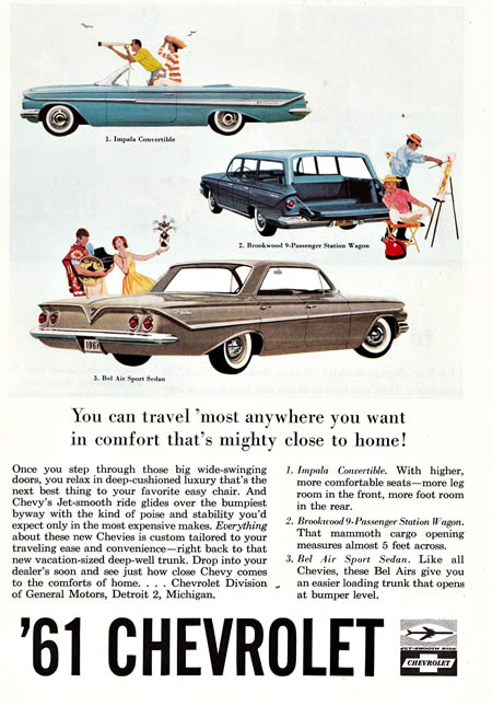 En 1961 la silueta del Chevrolet de gran formato cambia radicalmente y las aletas de cola separadas de la carrocería desaparecen prácticamente. Todavía los boceles angulosos en los costados sugieren formas de alas, pero progresivamente la silueta será menos adornada, conforme pasa la década de los sesenta.