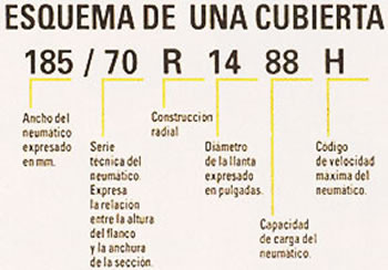 Para garantizar estos parámetros de diseño y utilización, los neumáticos llevan grabados en relieve en los laterales, unos códigos con una serie de números y letras, mediante las cuales se puede identificar las características de mayor relevancia del neumático, como son sus dimensiones principales, características de construcción y requerimientos de utilización.