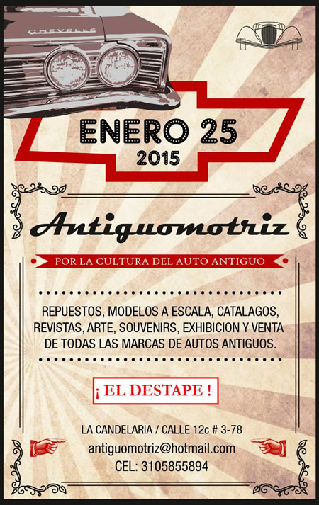 Arranca el 2015 en Antiguomotriz, poniendo sus motores a punto para iniciar este año con la exhibición y puesta en escena de los autos que Chevrolet a mediados de los 60´s fabrico con el nombre de Chevrolet Chevelle. Nos acompañaran diferentes propietarios con estas reconocidas joyas automotrices en sus diferentes versiones y así poder apreciar de primera mano sus cualidades y calidades en su estructura y potencia de sus motores. Los esperamos el próximo domingo 25 de enero para abrir el telón, que nos llevara a seguir disfrutando de la pasión por los autos antiguos.