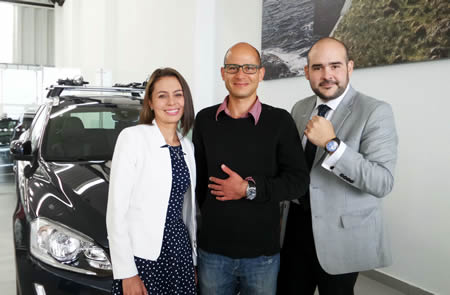 Pie de foto: Luisa Ocampo, jefe de mercadeo de Volvo Cars; Juan Manuel Becaría, ganador de #MomentoVolvo; y Carlos Ariza, gerente de mercadeo de Bomberg.