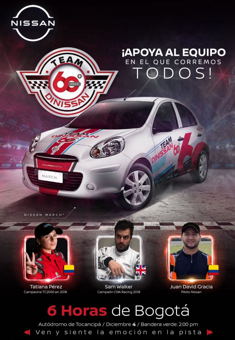 En el marco de su celebración, la empresa ha decidido seguir recorriendo caminos y hacer parte de la carrera de Las 6 horas de Bogotá con el Equipo Dinissan 60 años, conformado por los pilotos Tatiana Pérez, Juan David Gracia y el británico Sam Walker. La tripulación de Dinissan competirá a bordo de un potente Nissan March y harán uso de todas sus habilidades en la pista.