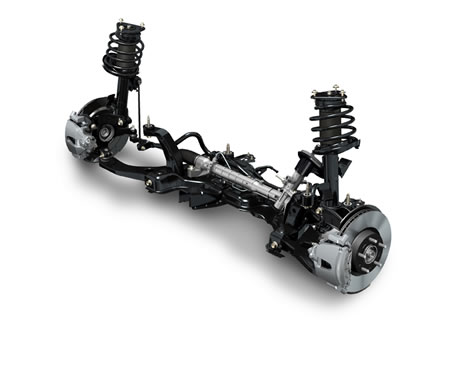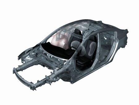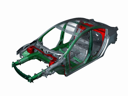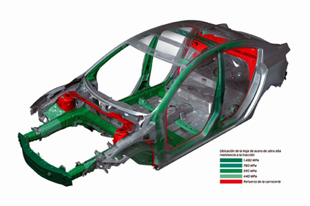 La proverbial rigidez del Mazda 3 all new, se aumentó aún más al emplear aceros de alta resistencia a la tracción, reforzando los puntos de anclaje de las suspensiones y torres traseras, además de unir las 2 torres de anclaje de los amortiguadores delanteros entre sí, y con fuertes refuerzos que salen de éstas hacia el panel parallamas.