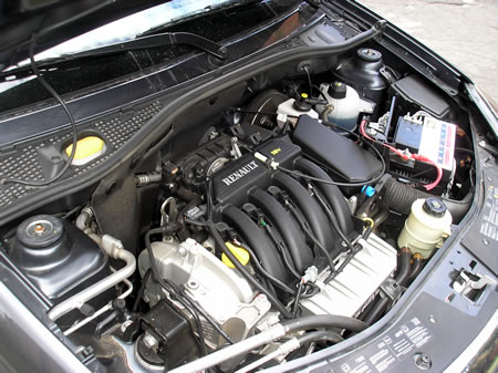 Al encender el motor nos encontramos con el 4 cilindros K4M de 1.600 c.c también usado en los Renault Scenic,Megane I,Symbol y el Clio que se vende actualmente en Colombia , con 16 válvulas, que sustituye a los habituales 8 válvulas presentes en los Logan y Sandero. El rendimiento de este motor es muy bueno y su consumo muy contenido. Esperábamos una respuesta más contundente a bajas revoluciones, superior a la ya excelente que encontramos en los motores de 8 válvulas, pero esta respuesta superior la recibimos después de las 3.000 rpm y la disfrutamos en velocidad punta, claramente superior también a la de los 8 válvulas.