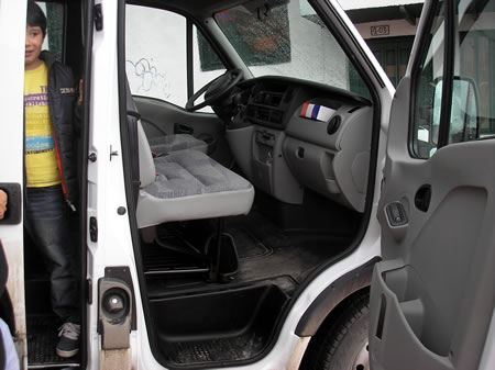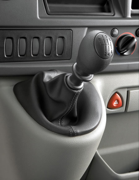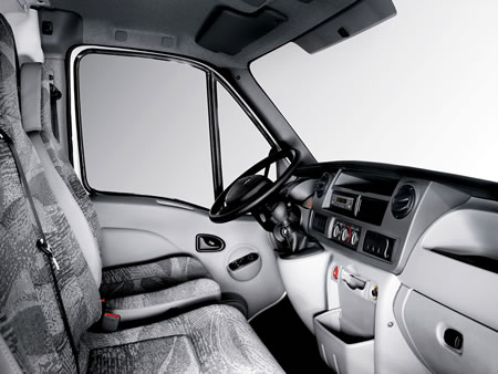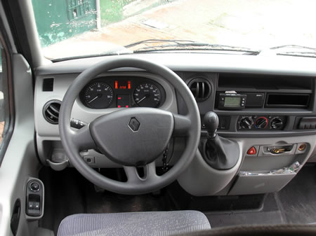 Impacta por su tamaño exterior, por el ADN de marca presente en toda la carrocería y en espacial por su altura, sin embargo subir y bajar de él no es difícil, un escalón ubicado muy abajo facilita la labor, espacialmente para personas de baja estatura. Una vez en el puesto de conducción encontrar la posición óptima de manejo en la silla es sencillo, cabe de decir que la comodidad que ofrece esta banca es muy buena, incluso cuando se conduce por largos periodos de tiempo. Desde la silla del piloto se tiene acceso a todos los mandos del completo panel, manejo del aire acondicionado para el conductor y los dos acompañantes delanteros, lo mismo que del sistema de enfriamiento que atiende el espacio trasero donde viajan los 13 pasajeros, cabe decir que la capacidad de enfriamiento de los sistemas de aire acondicionado es estupenda. Tanto los pedales como las perillas que accionan las luces y el limpiaparabrisas son los mismos que encontramos en los automóviles Renault y de una suavidad similar. Lo mismo sucede con el panel de instrumentos que es similar también al de sus hermanos más pequeños y conocidos por todos. Conducirlo es más sencillo de lo que parecería a simple vista, el timón de generosas dimensiones desde el que se acciona un sistema de dirección asistida de gran precisión. También la ubicación de la palanca del cambio de velocidades, en la parte inferior del panel de instrumentos y muy cerca de la mano del conductor, aporta lo suyo a la ergonomía, gracias a los recorridos cortos y precisos. La visibilidad hacía delante es estupenda, mientras que unos espejos grandes de dos cuerpos cada uno se encargan de informar sobre los acontecimientos en la parte trasera del vehículo. Los pasajeros acceden al interior desde una amplia puerta corrediza de fácil apertura, y se ubican en las cuatro filas de asientos de buena comodidad, donde cada uno encuentra un cinturón de seguridad de dos puntos, buena ventilación y una buena visión del panorama exterior. La altura de la cabina monocasco en su parte posterior es una de sus mayores fortalezas, ya que pasajeros hasta de 1,80 m de estatura pueden transitar por allí sin tener que agachar sus cabezas. El Master para pasajeros cuenta con un espacio de carga ubicado debajo de la última fila de asientos, que permite ubicar el equipaje de los pasajeros, aunque hay que decirlo no es un comportamiento gigantesco en proporción con la cantidad de viajeros que generalmente llevan mucho equipaje.