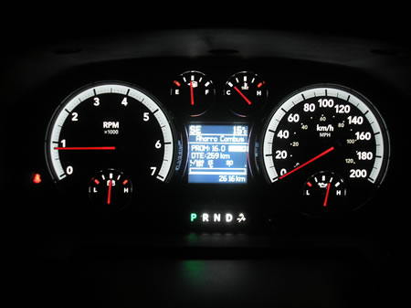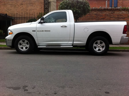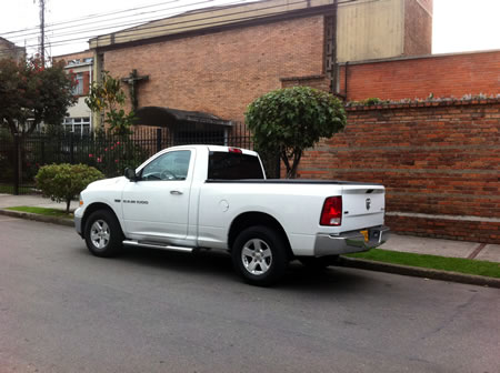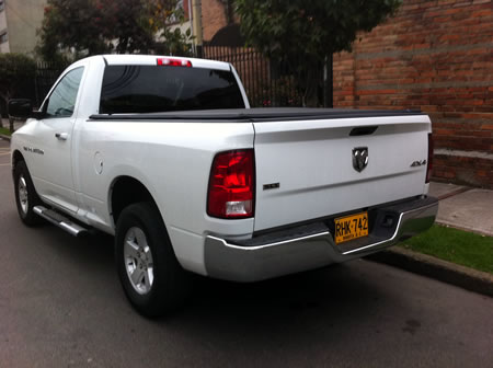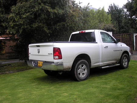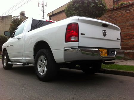 La visibilidad es estupenda y la sensación de poder al volante excelente. Las sillas son cómodas así el apoyo lateral no sea del todo apropiado. Los instrumentos se pueden con un sólo golpe de vista. Los mandos son suaves y precisos de accionar. La ventilación de la cabina es apropiada y si se desea modificarla se cuenta con calefacción y aire acondicionado. El sistema de audio es estupendo, con el disco duro con que cuenta es posible disfrutar de varios días de música al gusto sin tener que repetir dada su capacidad de almacenamiento en su disco duro. La calidad del sonido también es algo destacado. Tanto el conductor como sus dos acompañantes viajan con gran comodidad. Si se desea a la silla central se le puede abatir el espaldar para tener una buena bandeja para documentos u objetos delicados, que complementa las grandes guanteras ubicadas frente al pasajero y separadas por el airbag. Para subir a la camioneta cuenta con estribos que facilitan esta maniobra tanto como el bajar, algo especialmente apreciado por niños o personas de baja estatura o avanzada edad. La insonorización de la cabina también es algo muy bien logrado, con sólo subir los vidrios ya se queda perfectamente aislado del ruido exterior, además del motor solo se escucha a lo lejos el ronroneo de los 390 caballos. Al encender el motor el silencio sobresale, luego de bajar la palanca de cambios hasta la posición D (drive) y con un leve toque al pedal del acelerador arranca sin problema alguno sin importar la carga, lo que se remolque y la pendiente de la vía. Si se acelera con energía el resto de vehículos desaparecen en los espejos retrovisores con una rapidez alucinante. La respuesta del motor es brutal y viajar pegados al espaldar algo habitual y se nos antoja lógico si tenemos en cuenta que la camioneta es movida por un poderoso motor V8, que durante la prueba en conducción mixta ciudad/carretera mostró un consumo promedio de 23 kilómetros por galón, una cifra bastante conservadora para la potencia, el torque del motor y el peso del vehículo. El funcionamiento de la caja de cambios es estupendo tanto en posición totalmente automática como secuencial, sus relaciones están muy bien calculadas para garantizar una brutal aceleración tanto en arrancada desde la inmovilidad como en recuperación y una altísima velocidad punta que a juzgar por lo visto durante la prueba puede rozar los 190 kilómetros por hora a la altura de Bogotá y de la sabana y un poco superior a los 200 kilómetros por hora a nivel del mar. El manejo del sistema que permite escoger entre tracción 4x2 y 4x4 se hace desde una perilla giratoria ubicada en el panel de instrumentos. Las suspensiones son muy amables con los ocupantes y fuertes para llevar carga. Su comportamiento tanto en vías rectas como plagadas de curvas es neutro y predecible. Los frenos la detienen con gran facilidad y precisión. Su altura al piso es sobresaliente y podría mejorar si no trajera montado de fábrica un faldón plástico en la parte inferior de la defensa delantera que le quita capacidades “off road “. El platón de gran capacidad cuenta con una cubierta que la protege bastante bien y que resulta sencilla de quitar y poner. Las luces halógenas delanteras se destacan por el estupendo diseño de los faros.